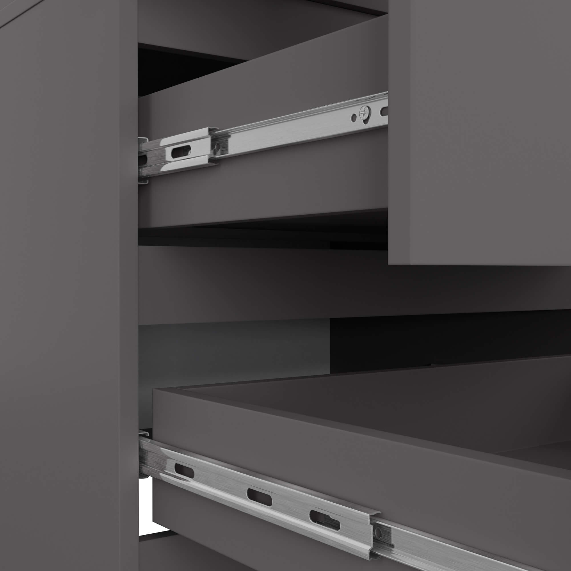 Konstrukce skříně i čela zásuvek jsou vyrobeny z kvalitní laminované desky Kronospan o tloušťce 16 mm, která se vyznačuje vysokou odolností proti oděru a snadnou údržbou. Viditelné hrany jsou opatřeny ochranným ABS obrzežením, které chrání nábytek před mechanickým poškozením a prodlužuje jeho životnost.