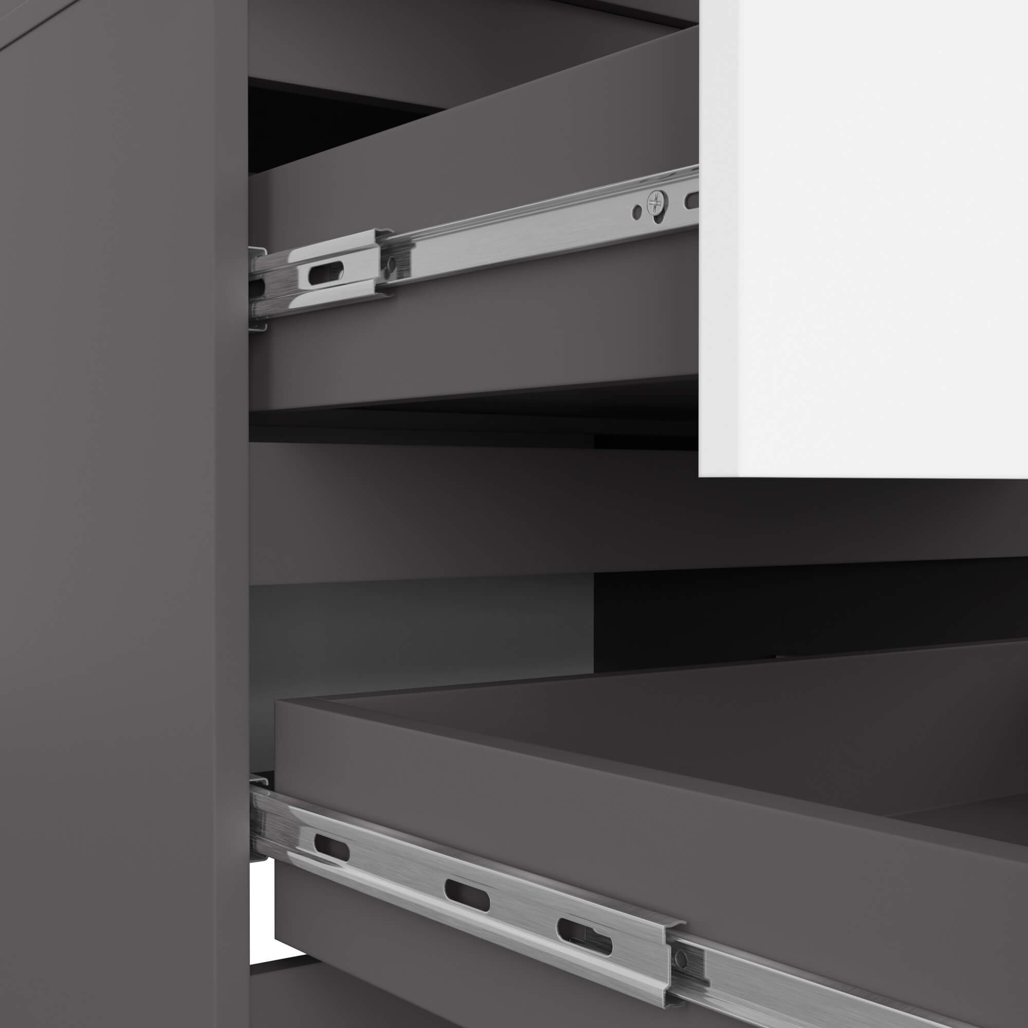 Vnitřní uspořádání skříně je navrženo s důrazem na praktičnost. Uvnitř se nachází police a šatní tyč, které umožňují zavěšení i uložení oblečení. Ve spodní části jsou umístěny dvě zásuvky vhodné pro prádlo, doplňky nebo jiné drobnosti. Zásuvky jsou osazeny kvalitními kovovými kuličkovými pojezdy renomované značky GTV, které zajišťují plynulý a tichý chod.