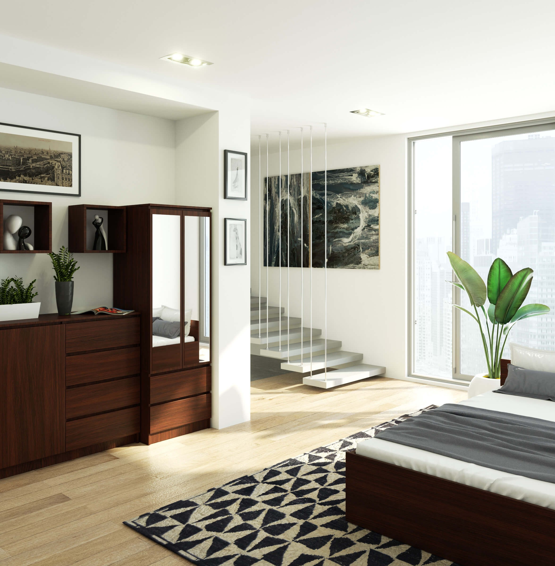 Přední část skříně je doplněna zrcadlem, které nejen zvyšuje komfort při každodenním používání, ale také opticky zvětšuje prostor místnosti. Vnitřní uspořádání skříně umožňuje přehledné uložení oblečení, přičemž zásuvky jsou osazeny kvalitními kovovými rolovacími pojezdy renomované značky GTV.