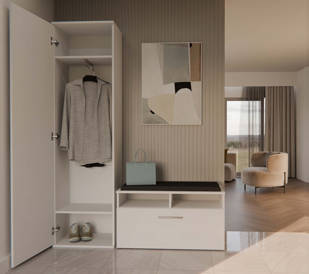 Je možné dokoupit kompletní garderobu DUO, která zahrnuje skříň DUO a doplňkovou část se skříňkou a věšáky. Ideální řešení pro ty, kteří potřebují více úložného prostoru a organizace.