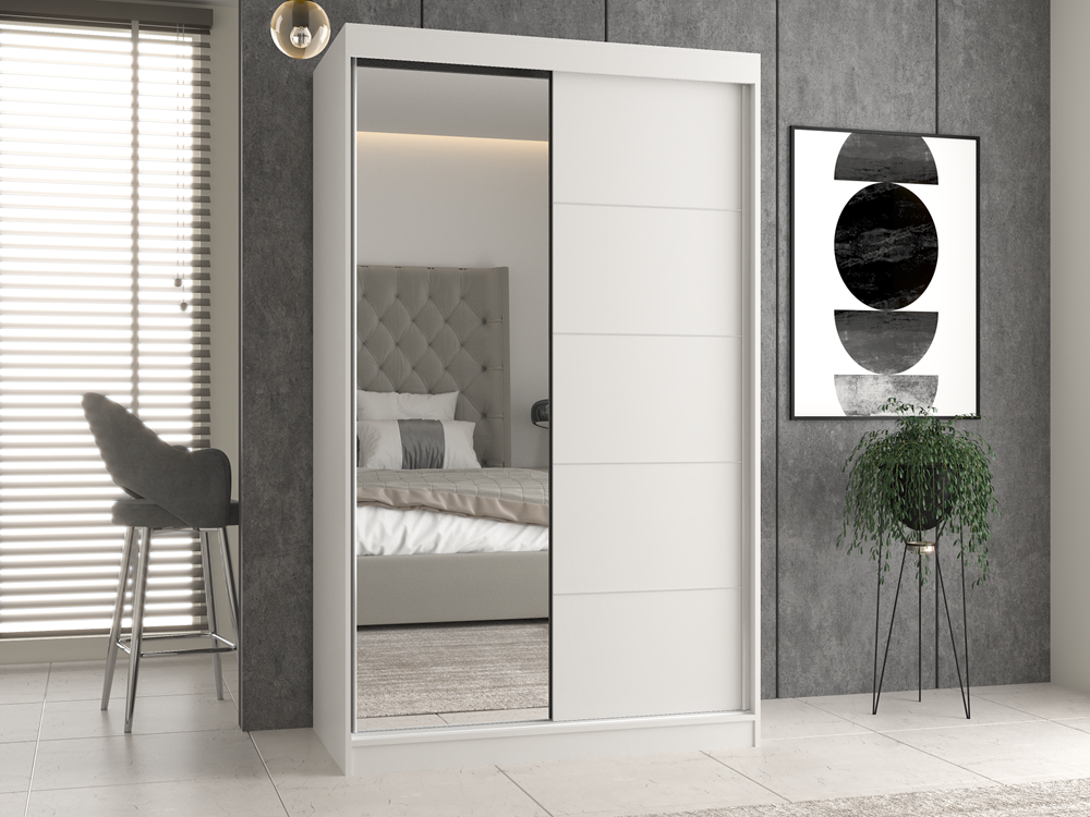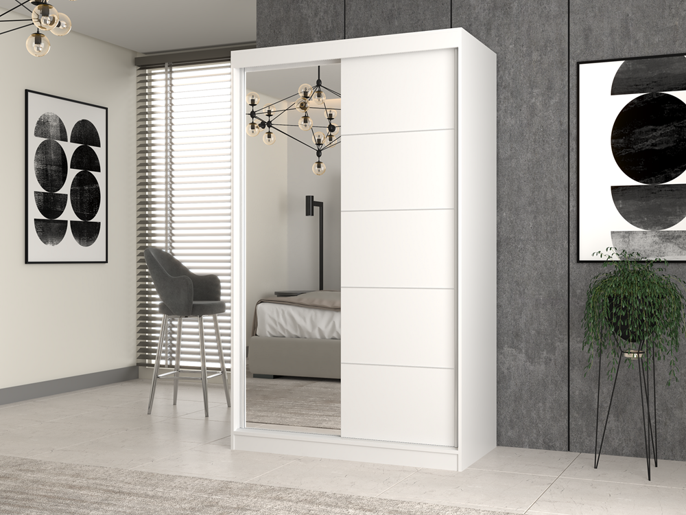 Na čele jedněch dveří se nachází velké zrcadlo. Díky tomu se místnost, ve které je skříň umístěna, opticky zvětší.