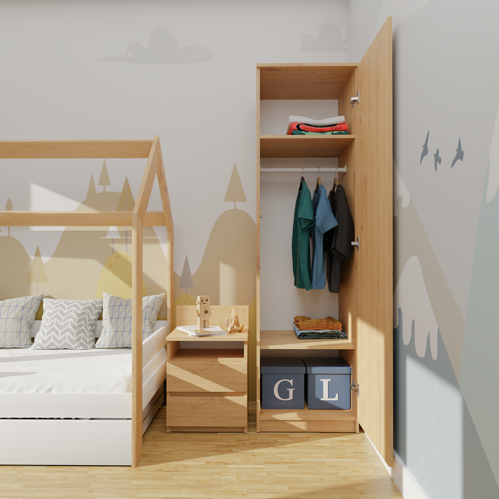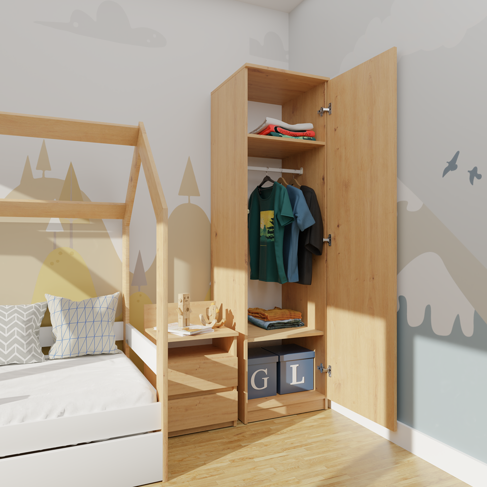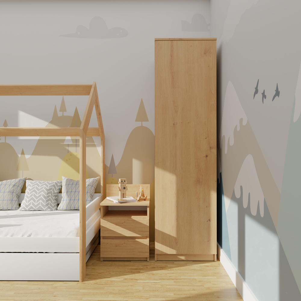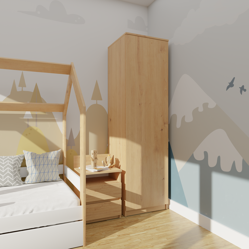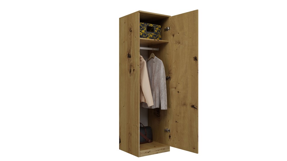 Skříň Malwa SD-50 v barvě dub Sonoma je moderní a funkční nábytek vybavený bezúchytkovým systémem TIP-ON, díky kterému se dveře otevírají jemným stisknutím čela. Umožňuje variabilní vnitřní uspořádání – při montáži lze zvolit instalaci čtyř polic nebo šatní tyče podle aktuálních potřeb. Vyznačuje se jednoduchým, lehkým a minimalistickým designem, který se hodí jak do ložnice či šatny, tak i do kanceláře nebo pracovny, kde nabízí prostor pro uložení dokumentů i svrchního oblečení. Skříň je vyrobena z vysoce kvalitní laminované desky odolné proti poškrábání a vlhkosti, s pevnými ABS hranami, a její hladké boční strany bez viditelných montážních otvorů podtrhují celkovou estetiku výrobku.