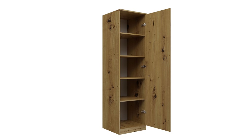 Úzká skříň s bezúchytkovým systémem TIP-ON je vyrobena z laminované dřevotřísky o tloušťce 16 mm, nabízí kompaktní rozměry vhodné do menších prostor, praktické vnitřní uspořádání s policemi a jednoduchý, moderní vzhled pro každodenní použití.