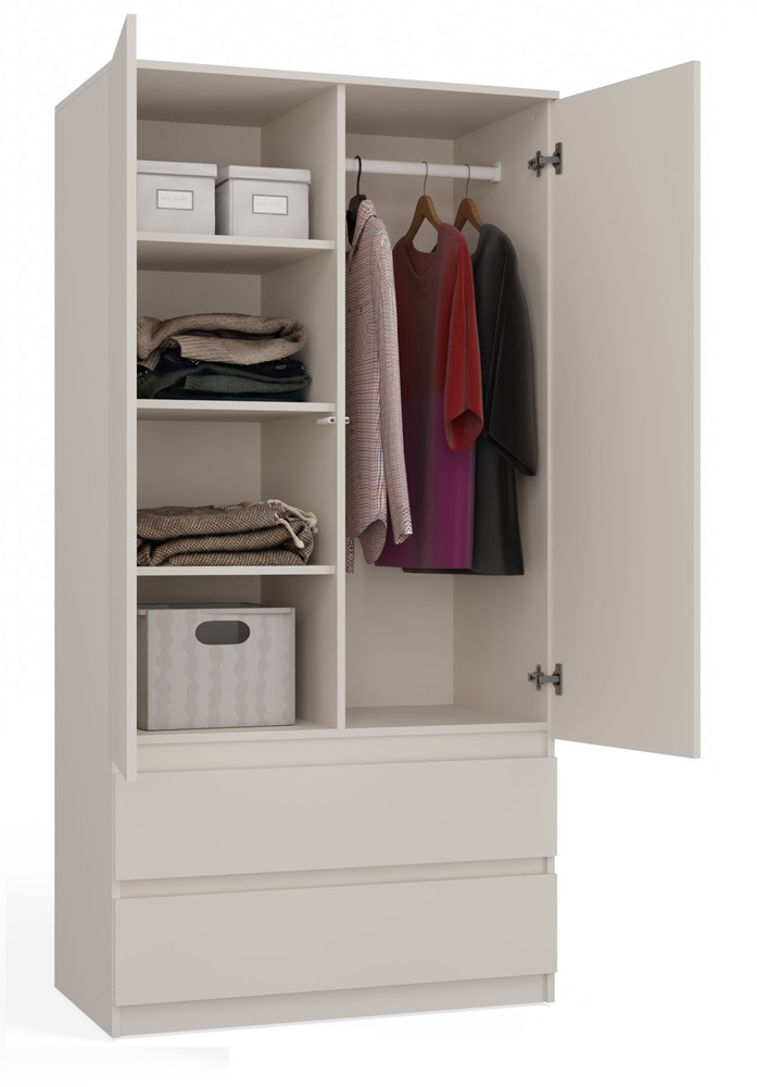 Šatní skříň MALWA SS-90 nabízí praktické uspořádání s policemi, šatní tyčí a zásuvkami, moderní design v kombinaci dub artisan a bílé barvy a je ideální volbou do ložnice i kanceláře.