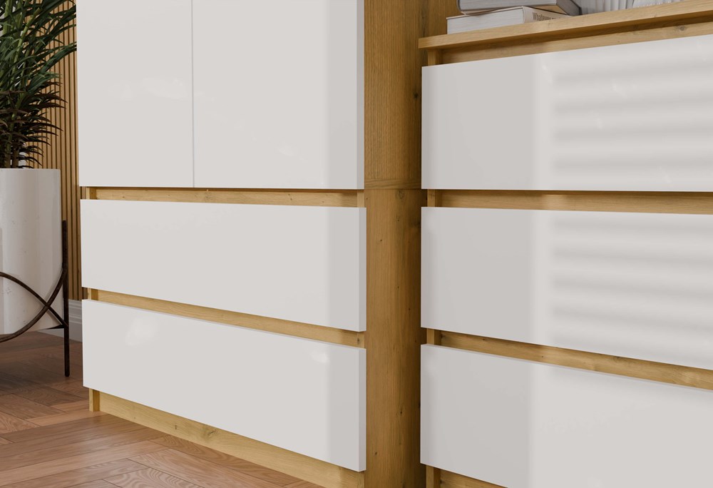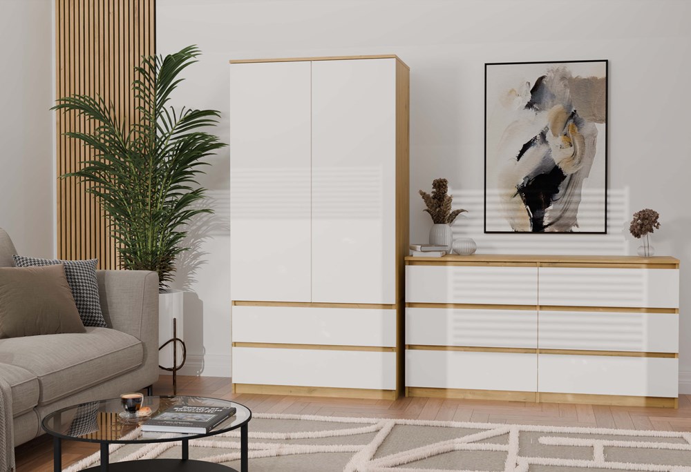 Šatní skříň MALWA SS-90 v kombinaci korpusu Dub Artisan a bílých frontů je ideální do ložnice i kanceláře, nabízí funkční vnitřní uspořádání se šatní tyčí na kabáty, saka a košile, pěti policemi na oblečení, dokumenty či boxy a dvěma prostornými zásuvkami na drobnosti, je vybavena bezúchytkovými dveřmi se systémem TIP-ON pro pohodlné otevírání lehkým stisknutím, má estetické boční panely bez viditelných otvorů, moderní design ladící s různými interiéry a pevnou konstrukci z laminované desky odolné proti poškrábání.