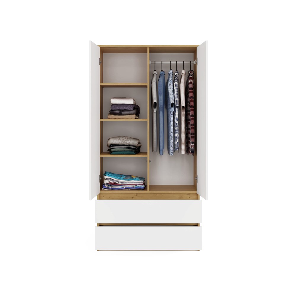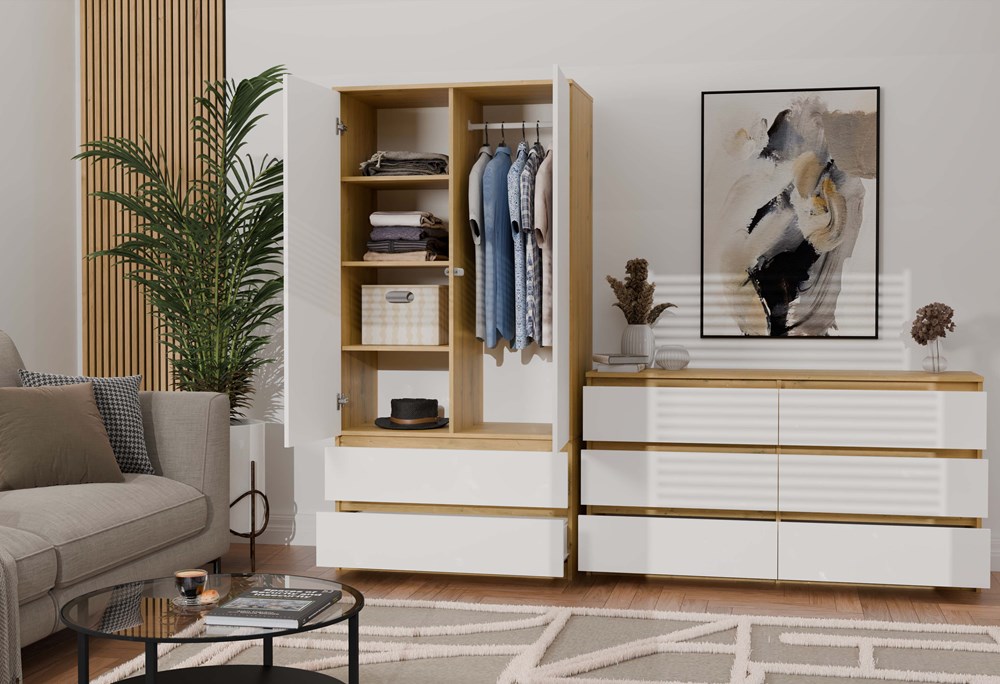 Šatní skříň MALWA SS-90 nabízí praktické uspořádání s policemi, šatní tyčí a zásuvkami, moderní design v kombinaci dub artisan a bílé barvy a je ideální volbou do ložnice i kanceláře.