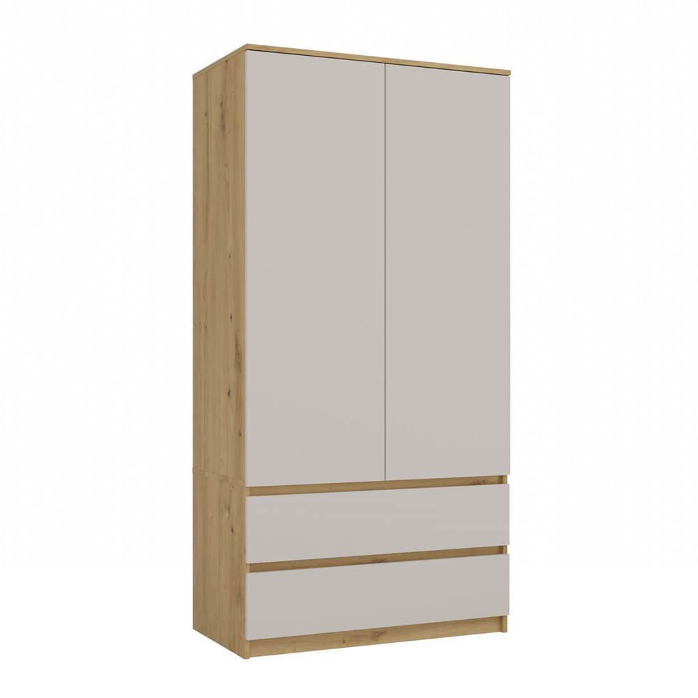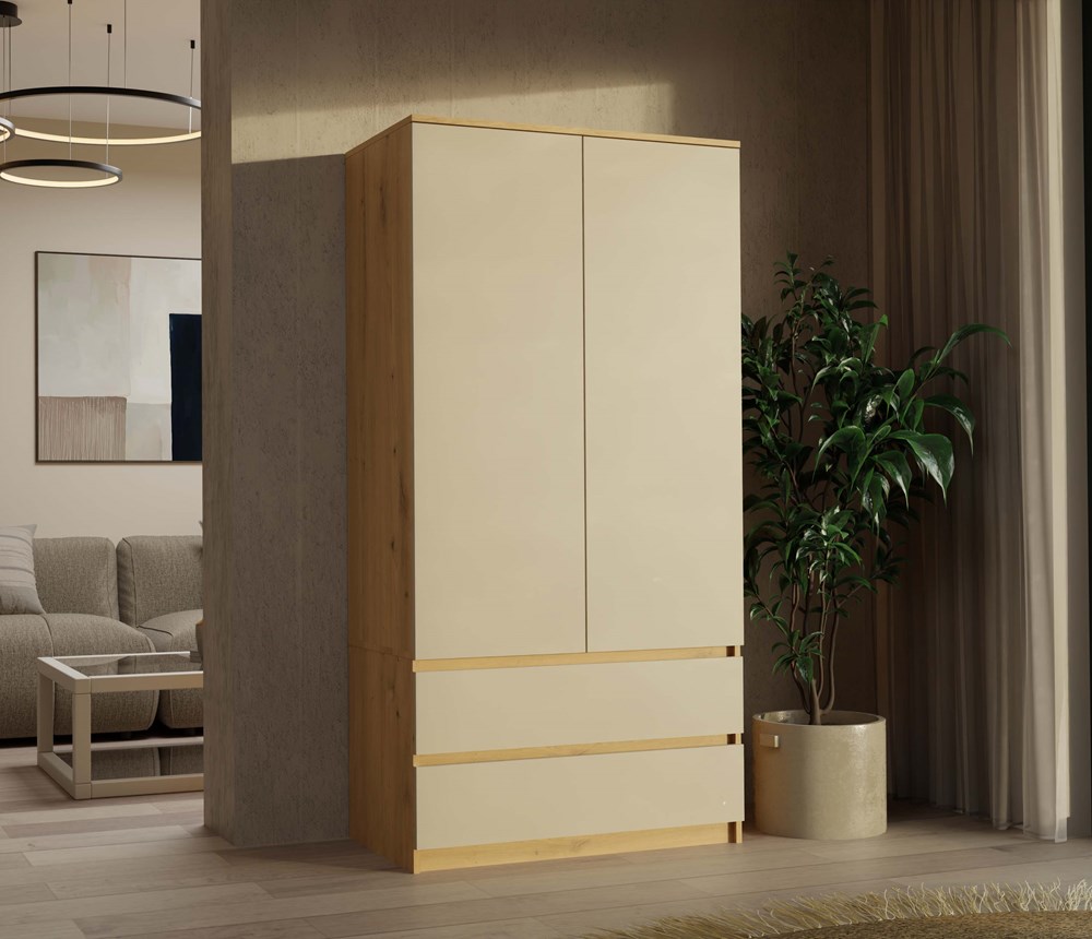 Šatní skříň MALWA SS-90 v kombinaci korpusu Dub Artisan a bílých frontů je ideální do ložnice i kanceláře, nabízí funkční vnitřní uspořádání se šatní tyčí na kabáty, saka a košile, pěti policemi na oblečení, dokumenty či boxy a dvěma prostornými zásuvkami na drobnosti, je vybavena bezúchytkovými dveřmi se systémem TIP-ON pro pohodlné otevírání lehkým stisknutím, má estetické boční panely bez viditelných otvorů, moderní design ladící s různými interiéry a pevnou konstrukci z laminované desky odolné proti poškrábání.