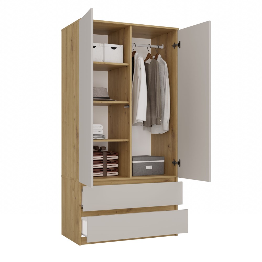 Šatní skříň MALWA SS-90 nabízí praktické uspořádání s policemi, šatní tyčí a zásuvkami, moderní design v kombinaci dub artisan a bílé barvy a je ideální volbou do ložnice i kanceláře.