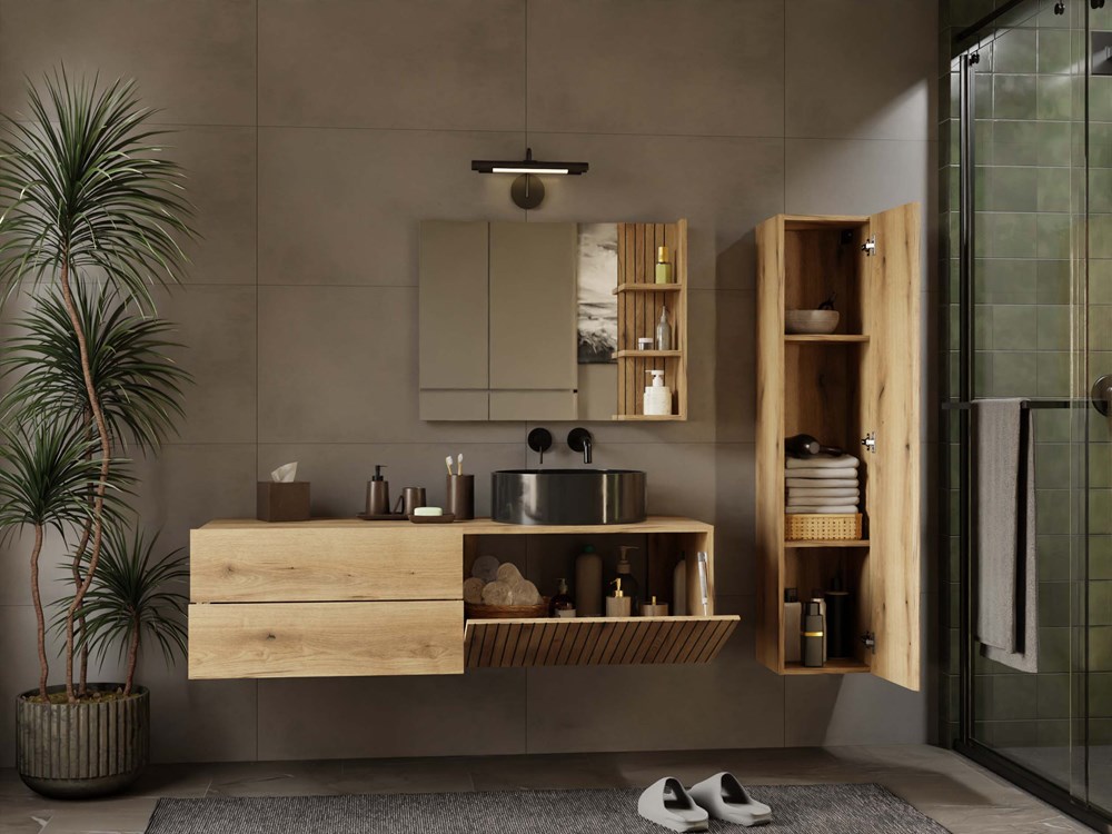TIGO 1D2S je elegantní a funkční koupelnová skříňka, která zaujme moderním designem a precizním provedením. Charakteristický čelní panel s vertikálním frézováním (imitace lamel) v teplém odstínu Dub Evoke dodává nábytku stylový a přirozený vzhled.