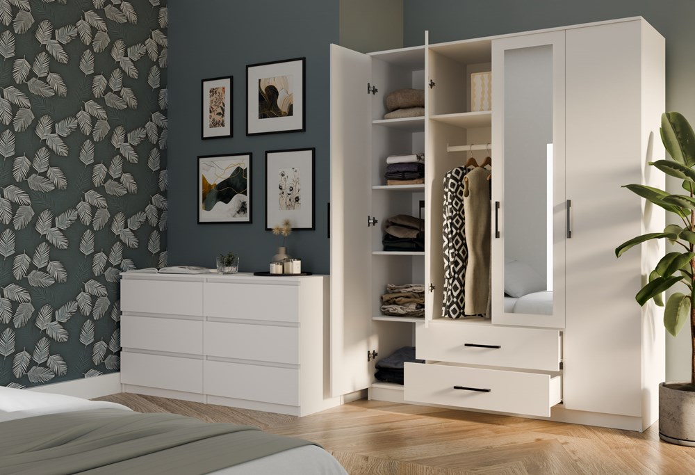 Šatní skříň ROMANA 160 se zrcadly v elegantní kašmírové barvě nabízí velký úložný prostor a moderní design. Je vybavena šatní tyčí, policemi a dvěma zásuvkami, zatímco zrcadla opticky zvětšují místnost. Ideální volba do ložnice i kanceláře.