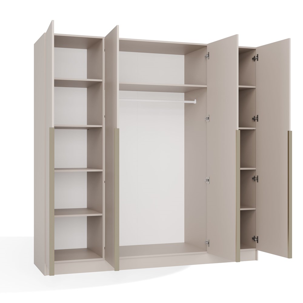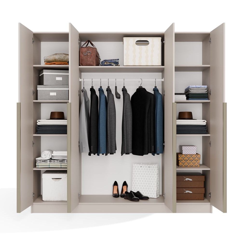 Skříň disponuje jedenácti objemnými policemi, které umožňují snadnou organizaci svetrů, triček, úložných boxů i doplňků. Široká část s šatní tyčí pohodlně pojme kabáty, bundy, obleky i dlouhé šaty. Čtyři dveřní křídla zajišťují rychlý a pohodlný přístup ke všem úložným zónám.