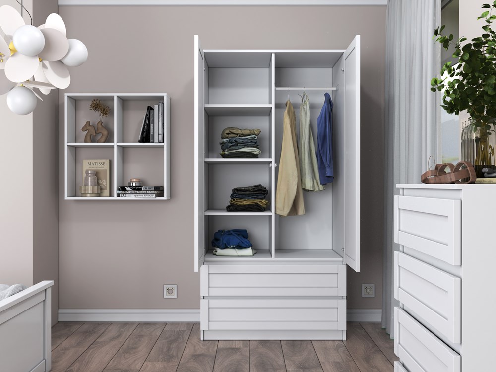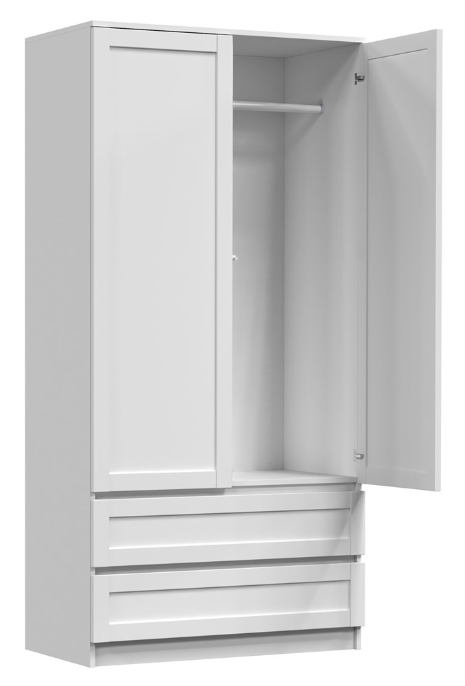 Šatní skříň PAFOS z kolekce RAMIAK je moderní a funkční kus nábytku, který se skvěle hodí jak do ložnice či šatny, tak i do kanceláře nebo pracovny, kde poskytne místo nejen pro dokumenty, ale i pro svrchní oblečení. Minimalistický design v bílé matné barvě v kombinaci s frézovanými bezúchytkovými čely ve tvaru rámků podtrhne elegantní charakter interiéru.