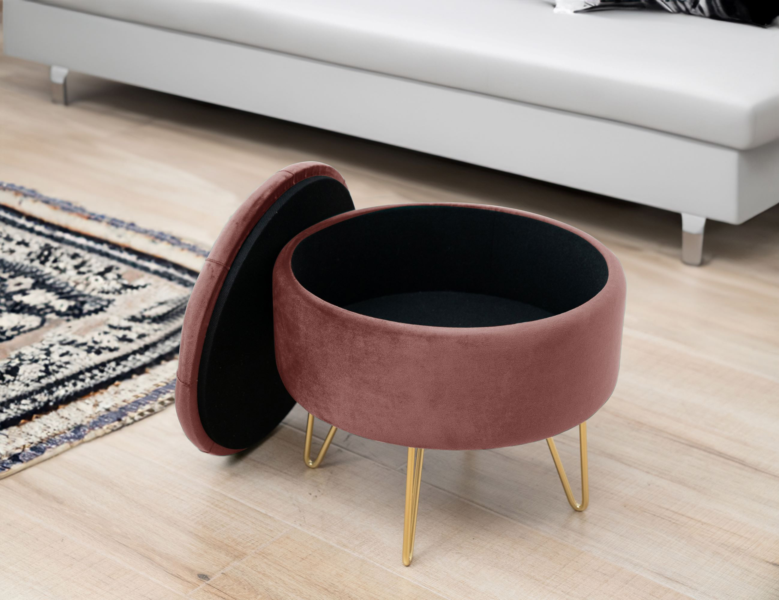 Taburet s úložným prostorem na zlatých kovových nohách je stylovým a funkčním doplňkem do obývacího pokoje i ložnice. Skvěle poslouží jako pohodlná podnožka, díky které si mohou unavené nohy po celém dni chůze dopřát zasloužený odpočinek. Měkký velurový potah navíc umocňuje příjemný pocit při relaxaci.