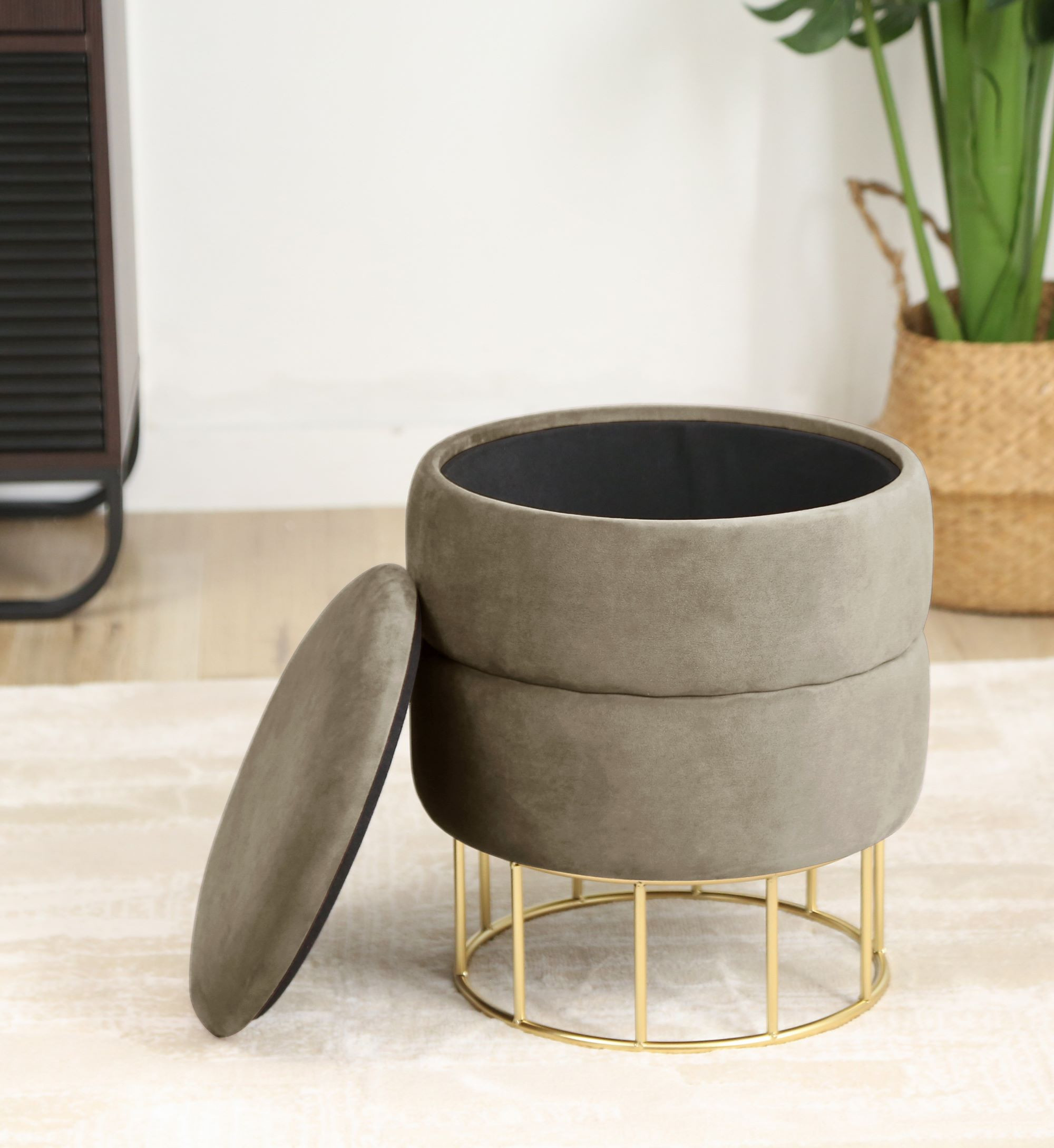 Taburet s úložným prostorem na zlatých kovových nohách je ideálním doplňkem do obývacího pokoje i ložnice. Skvěle poslouží jako pohodlná podnožka, díky které si mohou unavené nohy po celém dni chůze dopřát zasloužený odpočinek. Měkký velurový potah navíc umocňuje příjemný pocit při relaxaci.