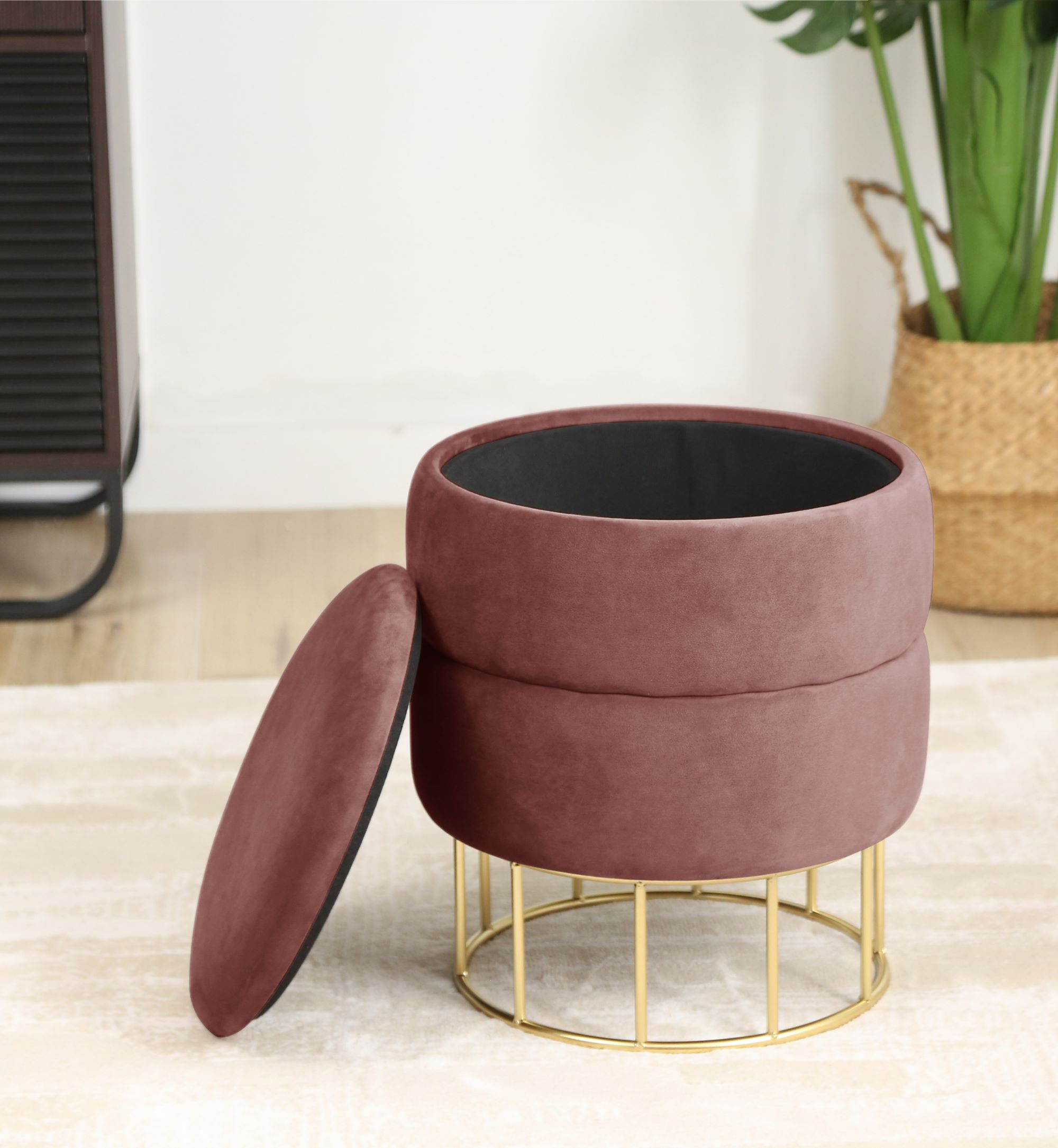 Taburet s úložným prostorem na zlatých kovových nohách je praktickým a stylovým doplňkem do obývacího pokoje i ložnice. Skvěle poslouží jako pohodlná podnožka, díky které si mohou unavené nohy po celém dni chůze dopřát zasloužený odpočinek. Měkký velurový potah navíc zvyšuje celkový komfort při relaxaci.
