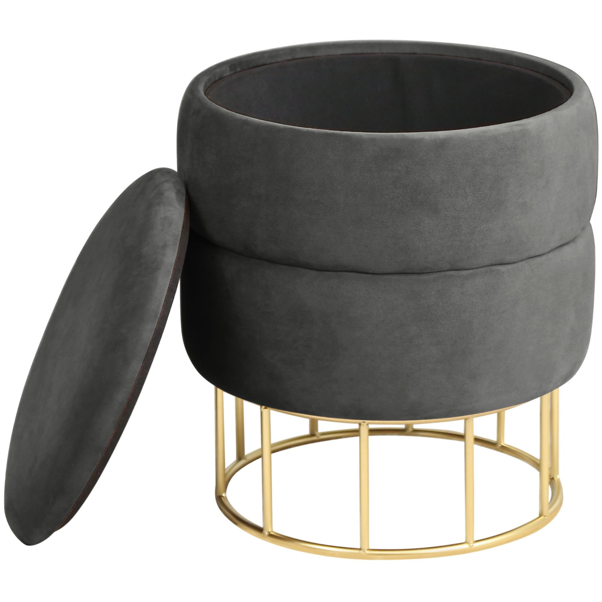 Taburet s úložným prostorem na zlatých kovových nohách je stylovým a praktickým doplňkem do obývacího pokoje i ložnice. Skvěle poslouží jako pohodlná podnožka, díky které si mohou unavené nohy po celém dni chůze dopřát zasloužený odpočinek. Měkký velurový potah navíc umocňuje komfort při relaxaci.