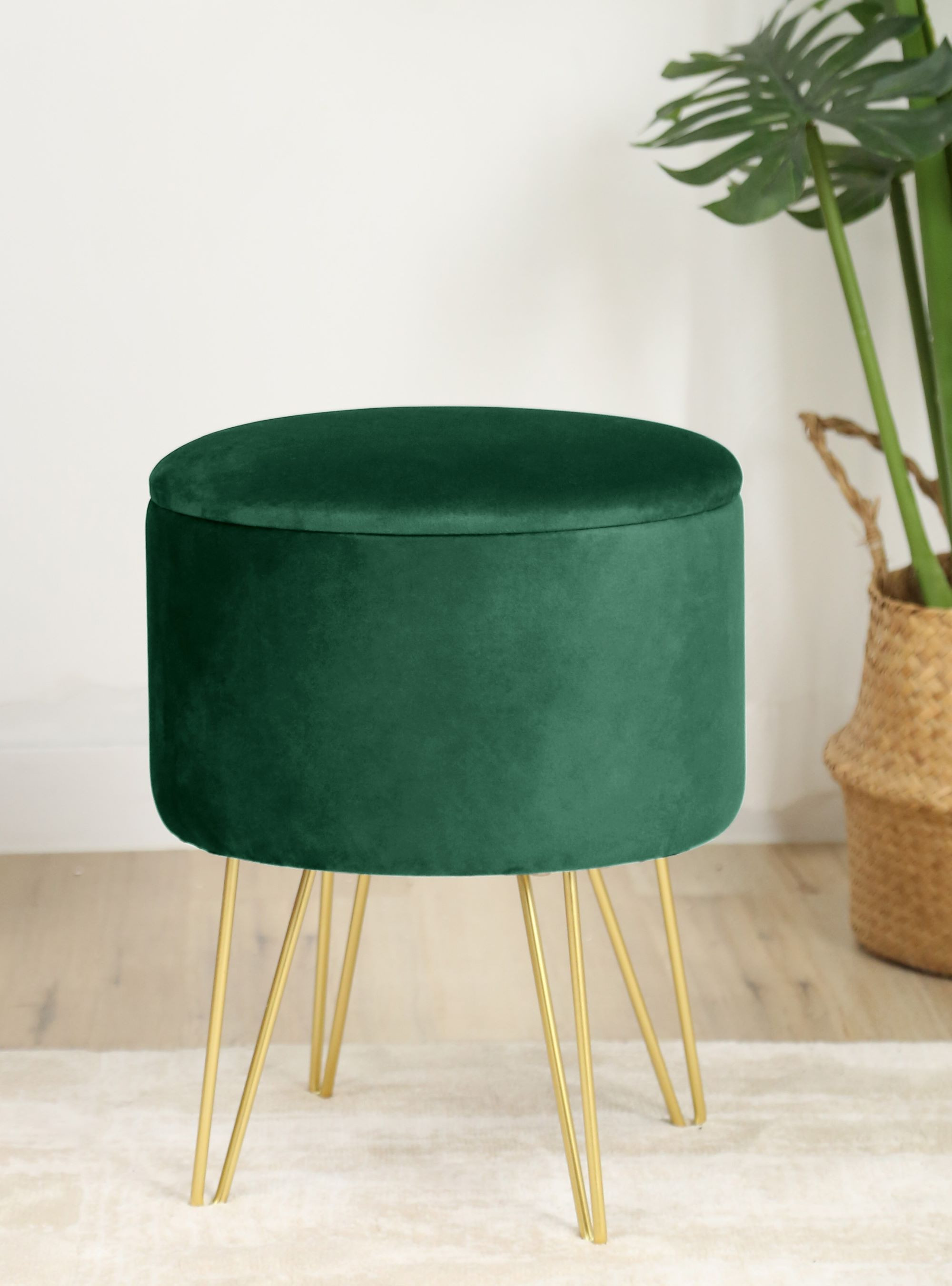 Taburet s úložným prostorem na zlatých kovových nohách je stylovým doplňkem do obývacího pokoje i ložnice. Skvěle poslouží jako pohodlná podnožka, díky které si mohou unavené nohy po celém dni chůze dopřát zasloužený odpočinek. Měkký velurový potah navíc umocňuje příjemné pocity při relaxaci.