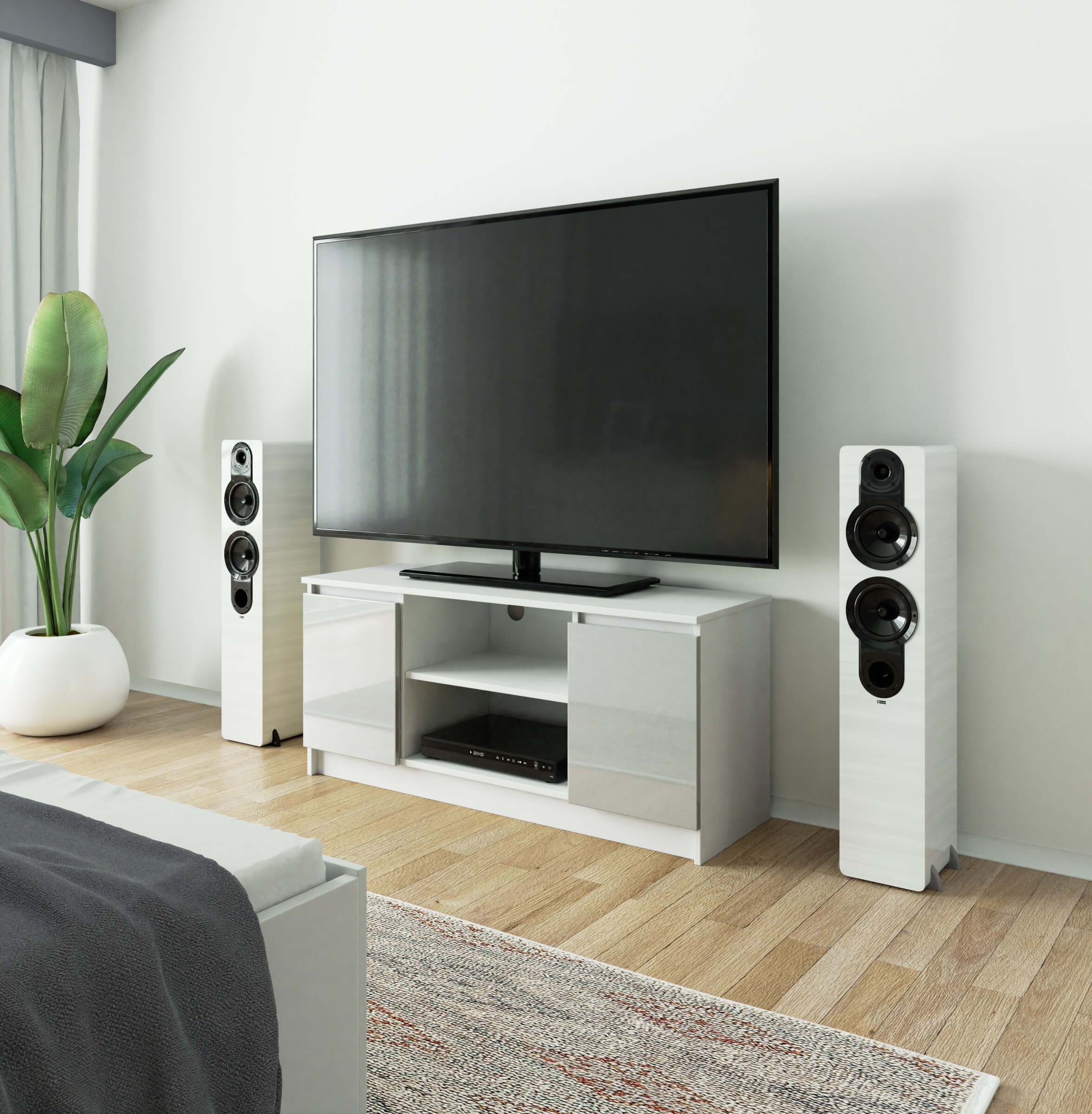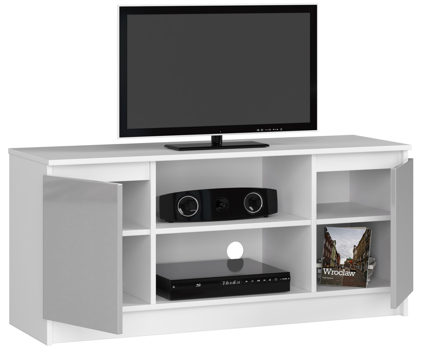 Televizní stolek K120 s bílou polomatnou konstrukcí a metalickými akrylátovými fronty ve vysokém lesku je moderním a elegantním řešením pro zařízení obývacího pokoje, ložnice nebo pracovny. Díky svému čistému designu a kompaktním rozměrům působí lehce, zároveň však nabízí dostatek prostoru pro uložení techniky i dalších nezbytností.