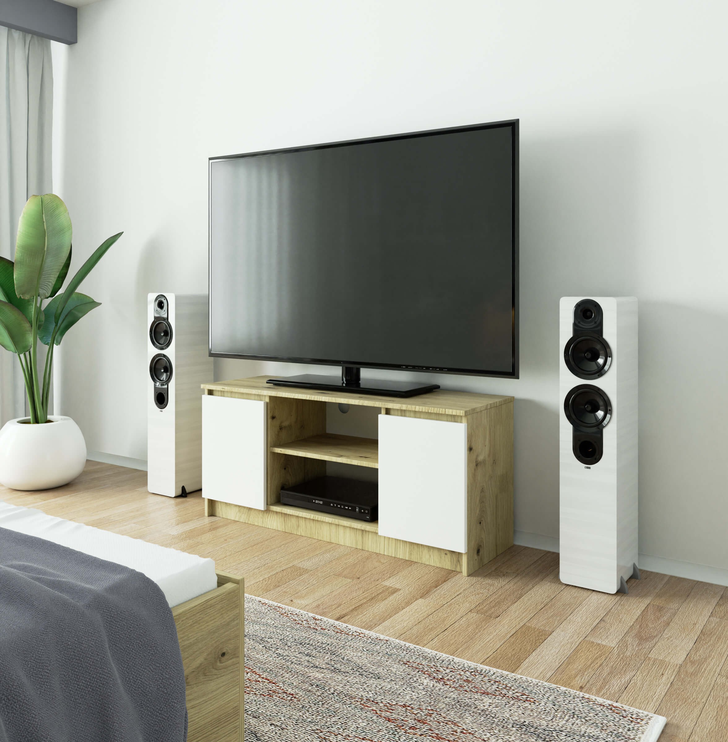Televizní stolek K120 v kombinaci dekoru dub artisan a bílých frontů je praktickým a estetickým řešením pro obývací pokoj. Díky šířce 120 cm poskytuje dostatek prostoru pro umístění televizoru i další elektroniky, aniž by působil robustně.