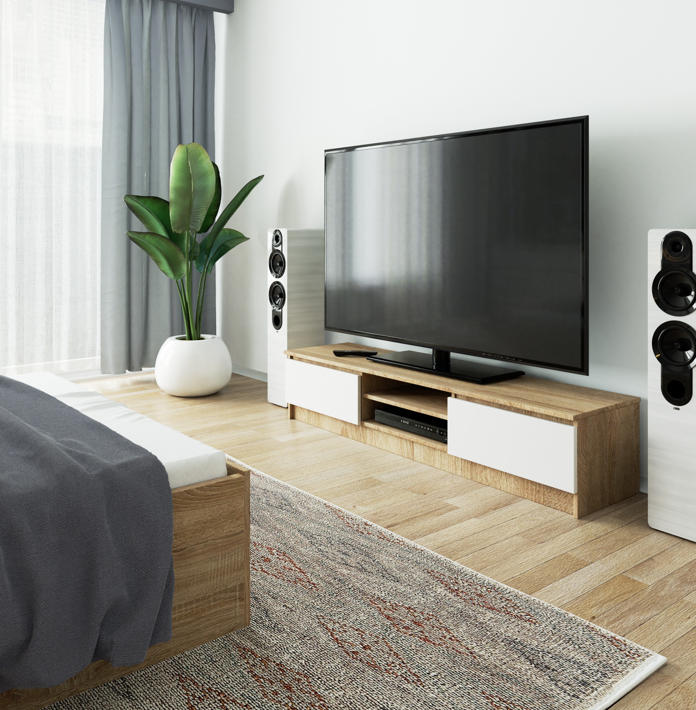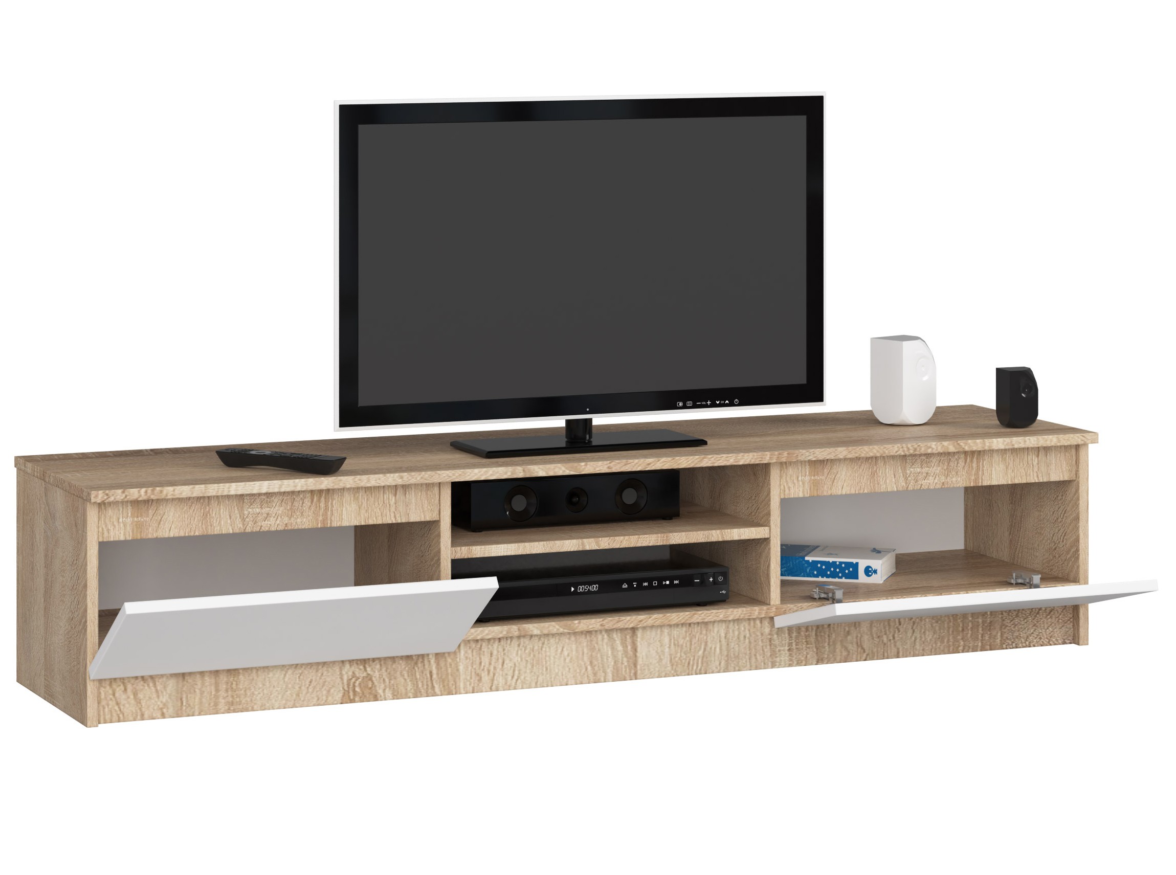 Televizní stolek K160 v dekoru dub sonoma s bílými fronty je moderním a funkčním řešením pro obývací pokoj, pokoj pro mládež i čekárnu. Kombinace přírodního dekoru dřeva s bílými prvky působí elegantně a zároveň svěže, díky čemuž se komoda snadno začlení do současných i designově laděných interiérů.