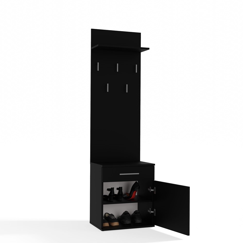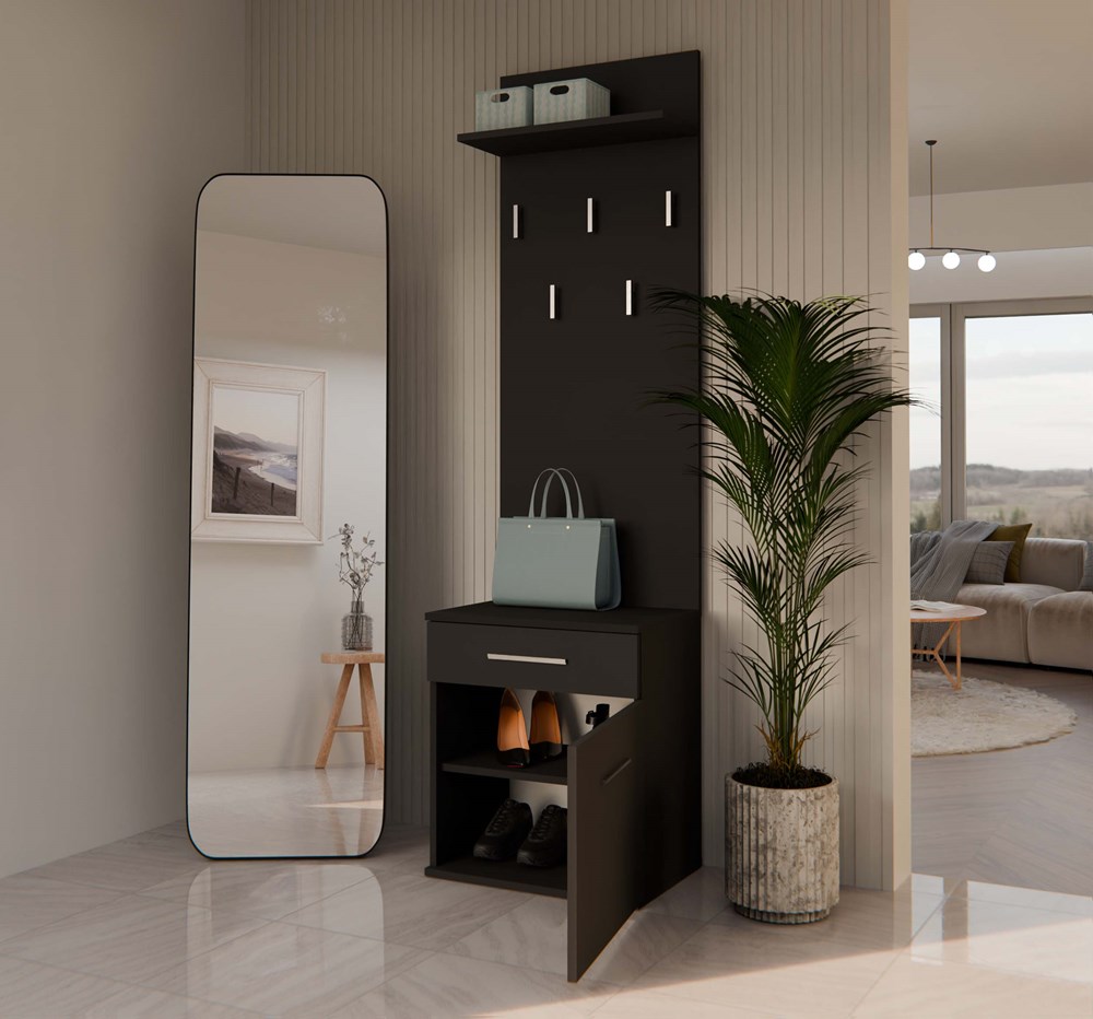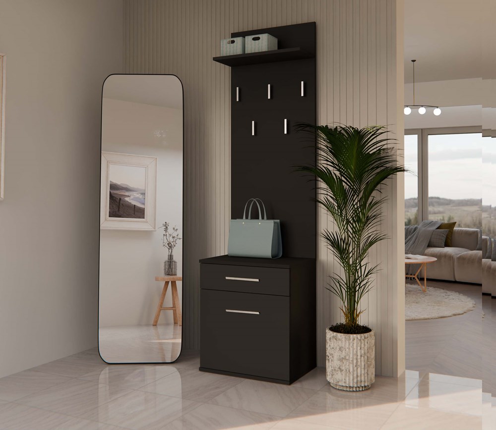 Set DUO v matném černém provedení je skvělou volbou pro ty, kteří hledají moderní, elegantní a praktické řešení do předsíně. Minimalistický design v kombinaci s nadčasovou černou barvou působí velmi stylově a snadno se sladí s jakýmkoliv interiérem.