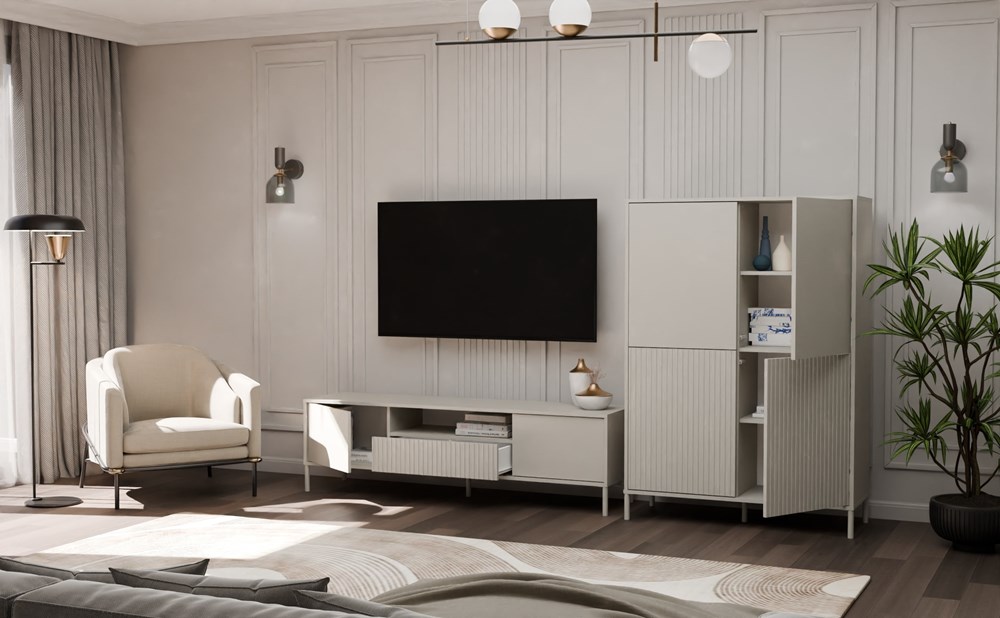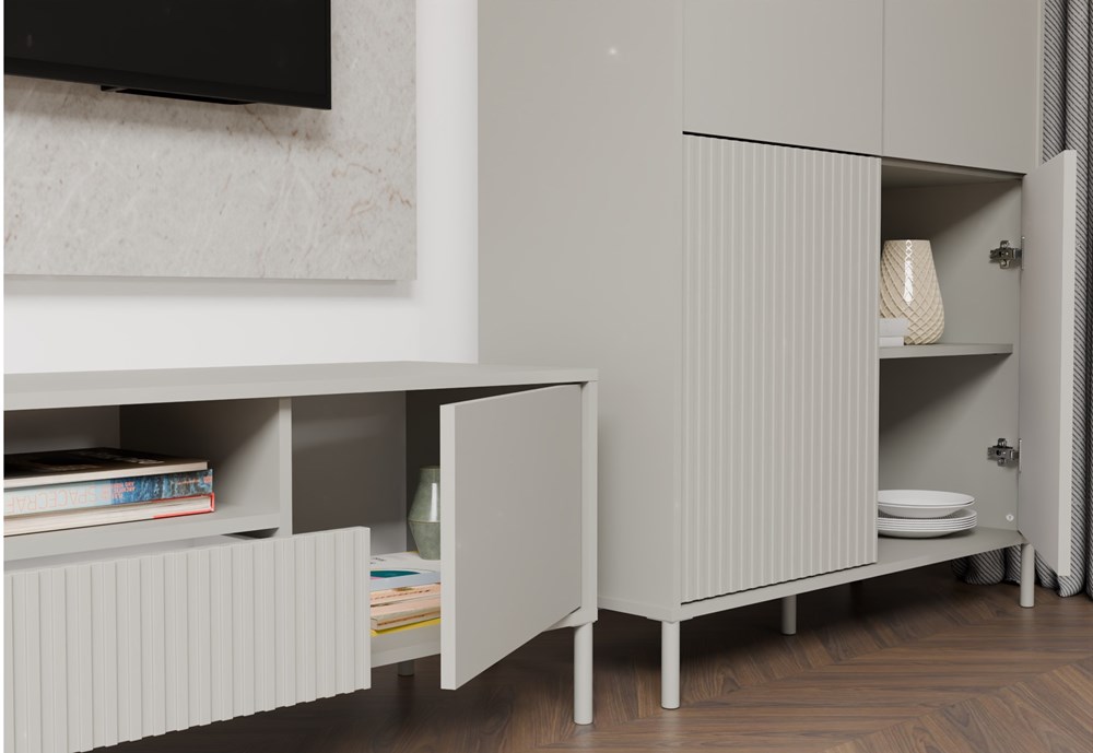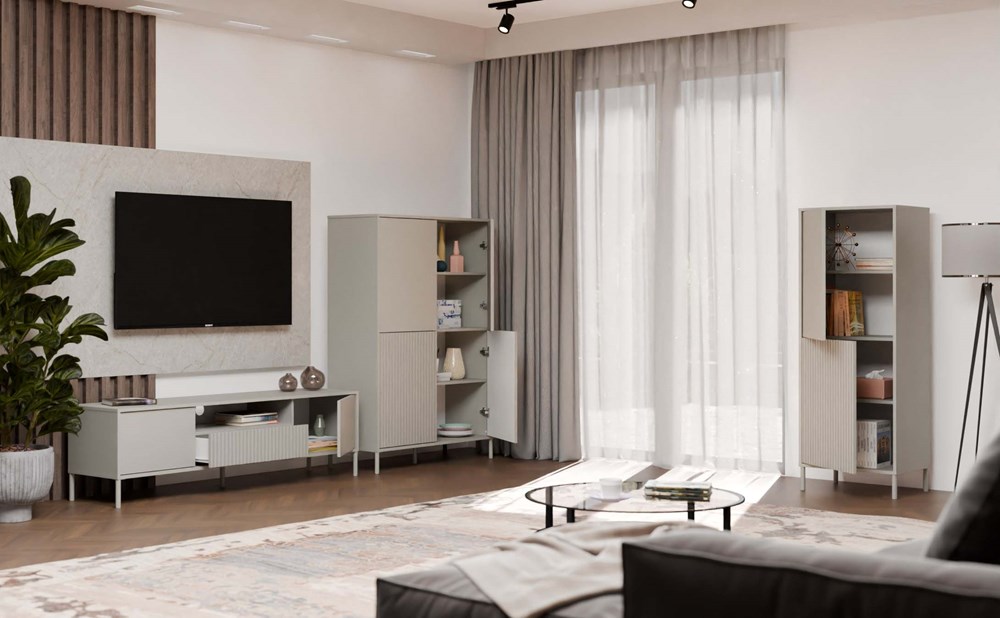 Vitrína KAMARO 4DK je moderní a funkční nábytek, který se skvěle hodí do obývacího pokoje, společenské místnosti, ložnice nebo pracovny. Díky větší šířce (103,5 cm) nabízí ještě více úložného prostoru a zachovává si elegantní a loftový charakter. Kombinace dveří s hladkým čelem a dveří s rýhovaným povrchem dodává stylový kontrast a systém TIP-ON umožňuje pohodlné otevírání bez úchytek. Povrchová úprava nábytku v módní barvě Kašmír (elegantní odstín béžové) dodává interiéru eleganci a moderní charakter, přičemž si zachovává neutralitu, která se snadno hodí k různým dekorativním stylům. Individuální konfigurace dveří – každé ze čtyř dveří lze libovolně namontovat, což umožňuje vybrat, které čela budou hladké a které rýhované. Díky tomu můžete přizpůsobit vzhled vitríny svým preferencím a stylu interiéru.